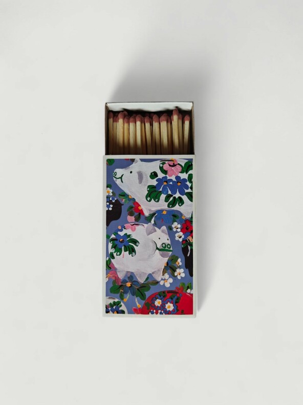 Fin aks med tändstickor. Dessa med motivet Spargrisar.